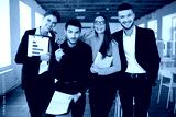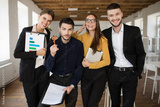 Group of young creative people in suits happily looking in camera together while spending time at work in modern office