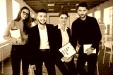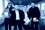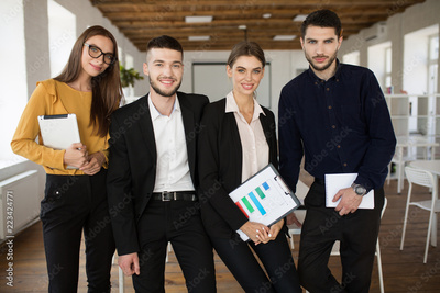 Group of young smiling business people in suits dreamily looking in camera together while spending time at work in modern office