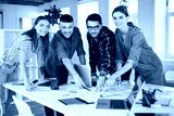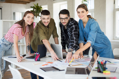 Young smiling creative people happily looking in camera working together with laptop. Group of cool guys working on new project while spending time in modern office