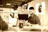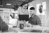 Young smiling business man and woman with laptop working together in modern office. Creative people spending time at work