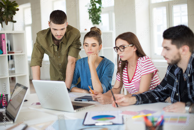 Young business people thoughtfully working on laptop together. Group of pensive men and women spending time at work in office