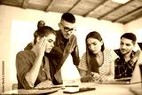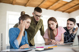Group of pensive men and women thoughtfully working with sketches while spending time at work. Young creative people thinking about new project together in modern office