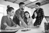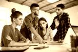 Group of business men and women thoughtfully working with sketches while spending time at work. Young people emotionally discussing new project together in modern office