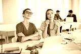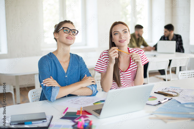 Young beautiful women dreamily looking aside while working together with laptop. Creative girls spending time in modern office