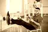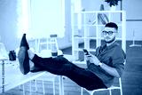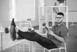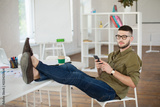 Young man in eyeglasses and shirt holding cellphone while sitting on chair with legs on table at work. Creative businessman dreamily looking aside in modern office