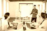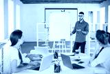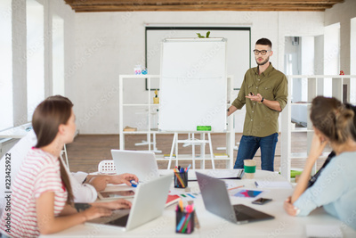Young handsome man in eyeglasses and shirt standing near board while discussing new project with colleagues. Group of people thoughtfully working together in modern office