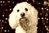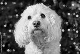 White hairy dog with Christmas lights in background
