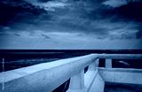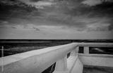 Black and white scene of mud beach at tide with grey sky and clouds. Perspective view from concrete bridge. Depressed, hopeless, despair, grief, lament, sad , and death concept. Loneliness life.