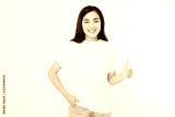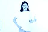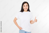 Young asian woman in template blank t shirt showing big thumb up isolated on white background. Happy and success concept. Copy space