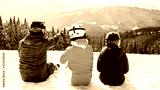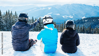 Three people in ski suits are sitting on the snow at the top of the mountain and looking into the distance.