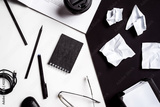 Black and white stylish office Flat lay cosmetics magazine glasses pens mascara brush cosmetics, coffee, creative. Office still life. Top view
