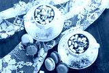 The concept of a cold winter morning. A pair of delicious cocoa drink with marshmallows in a Cup on a wooden table, top view. Hot coffee drink with marshmallows and sweets, top view.