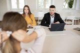 Young business man in eyeglasses with laptop and business woman thoughtfully talking with applicant about work. Young employers spending job interview in modern office