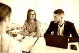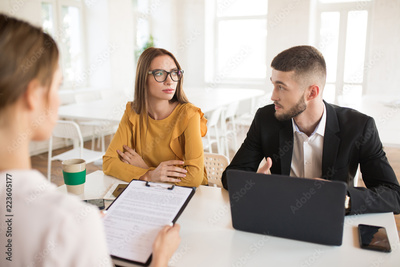 Young business man with laptop and business woman in eyeglasses thoughtfully looking at each other while talking with applicant about work. Young employers spending job interview in modern office