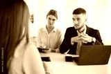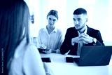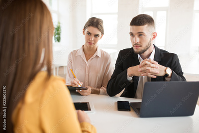 Thoughtful business man with laptop and business woman with pencil and folder in hands talking with applicant about work. Young employers spending job interview in office