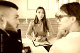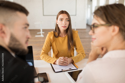 Young pensive woman in blouse dreamily looking at employers while spending time in modern office. Female applicant waiting results of job interview