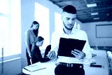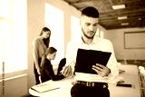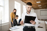 Young man with beard in white shirt thoughtfully holding folder while spending time in office with colleagues on background
