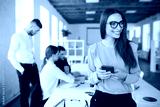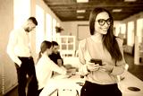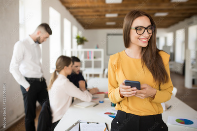 Young business woman in eyeglasses joyfully looking aside while holding cellphone in hands in office with colleagues on background
