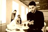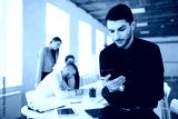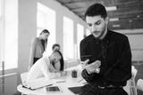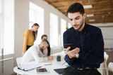 Young business man with beard in shirt thoughtfully using cellphone in office with colleagues on background