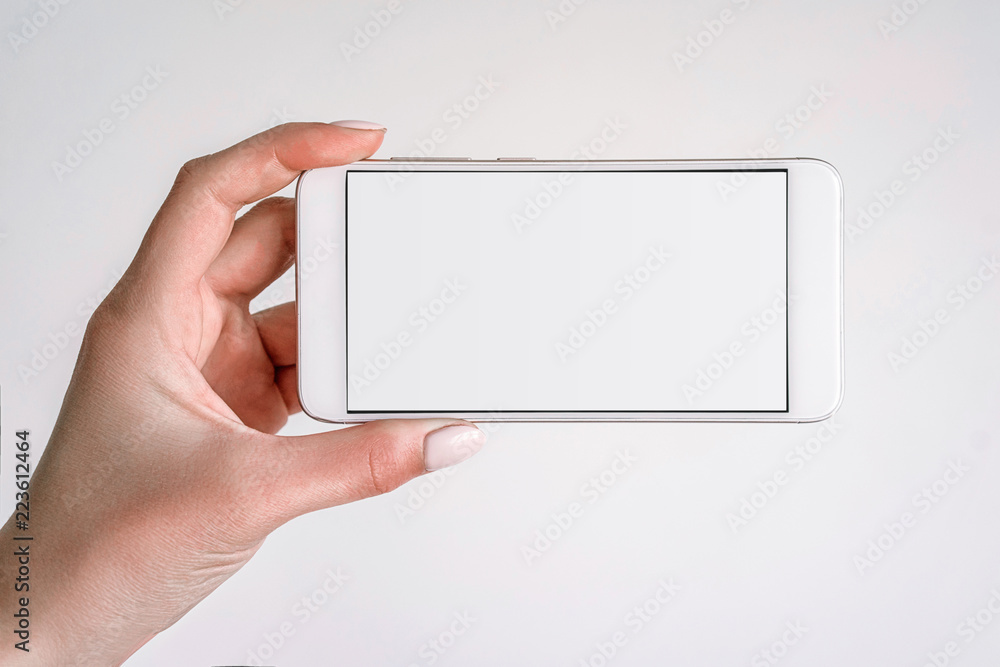 Mockup female hand model with white mobile phone with white screen on isolated background.