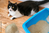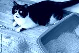 Cat toilet blue and black and white kitten on the wooden floor. The concept of cleaning the urine-absorbing fluid filling the toilet, unpleasant smell.
