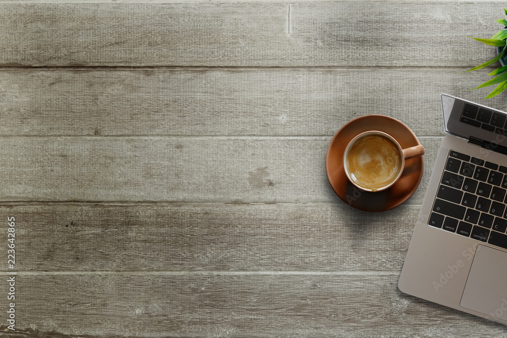 Office desk wood table with laptop computer, flower and coffee cup. Top view with copy space