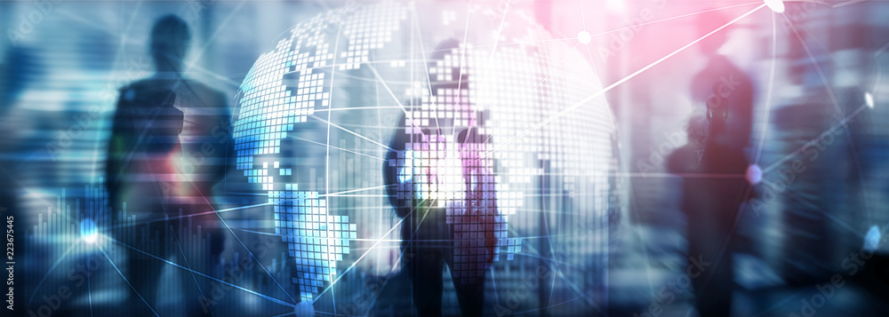 Double exposure mixed media. 3D Earth planet hologram and communication structure. World wide network and globalization concept.