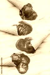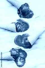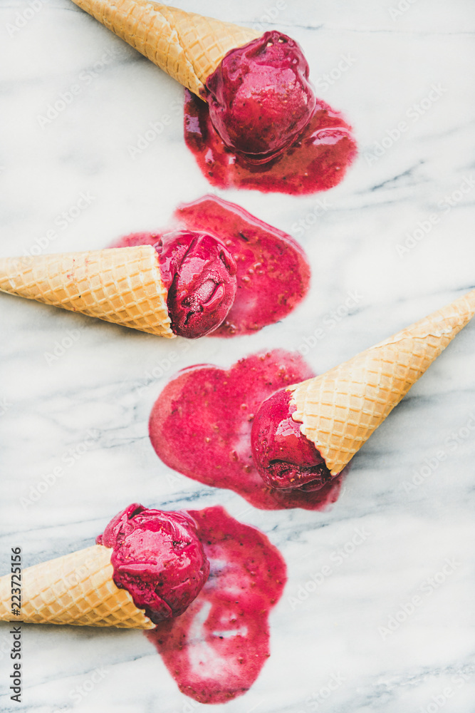Fresh summer dessert. Flat-lay of red melting natural raspberry sorbet ice-cream scoops in sweet waffle cones over light marble background, top view. Healthy vegan sweet food