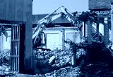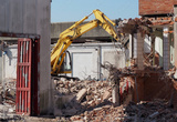 An excavator demolishes an industrial site for urban redevelopment in residential use