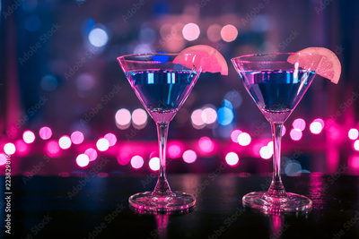 Row of wine, cocktail, champaign drinks on bar. Party, alcohol, club, nightlife concept.