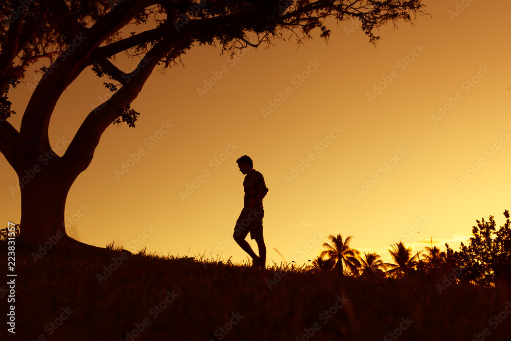 Silhouette of young man walking outdoors.