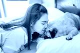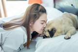 Beautiful Attractive Asian woman kissing her Cute dog pug breed sleeping on bed feeling so sweet and lovely,Friendship Concept