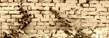 View of roses climbing against an old white painted brick wall with a blooming pink rose flower.