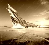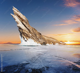 Cracked frozen lake with mountain on frozen lake Baikal in winter sunrise in Siberia, Russia