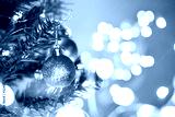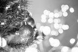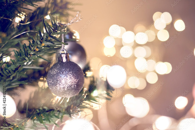 Closeup of silver bauble hanging from a decorated Christmas tree with bokeh, copy space, Xmas holiday background.