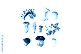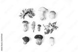 Autumn styled botanical arrangement. Composition of porcino mushrooms, Boletus edulis, rowan berries and lichen on white table background. Fall design, flat lay, top view.