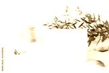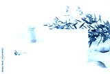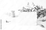 Bright feminine wedding stationery mockup scene. Closeup of woman hand holding handmade paper place card. Spool of silk ribbon, eucalyptus leaves and violet limonium flowers on white table background.