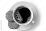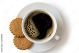 A cup of black coffee with two gingerbread biscuits isolated on white from above. White ceramic cup and saucer.