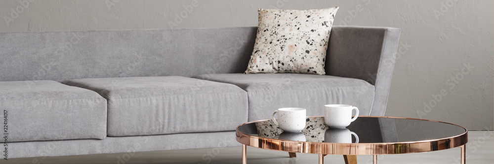 Real photo with close-up of two coffee cups placed on rose gold end table in room interior with grey sofa with lastrico cushion