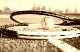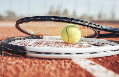 Tennis ball with racket on the tennis court. Sport, recreation concept