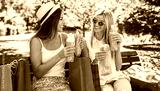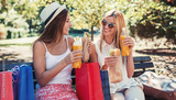 Shopping time. Beautiful women resting in the park after shopping. Consumerism, shopping, lifestyle concept