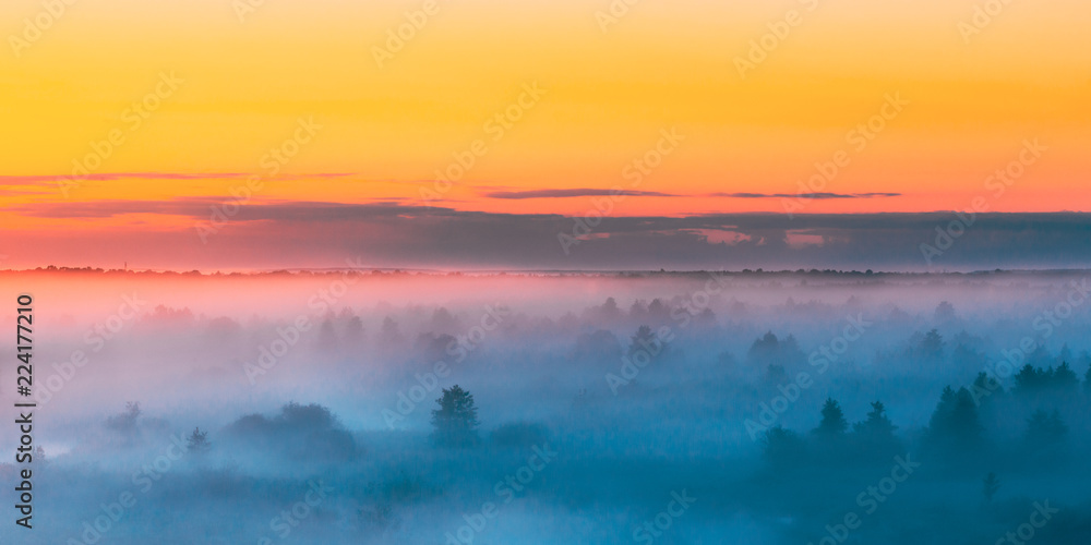 Sunrise Over Misty Landscape. Scenic View Of Foggy Morning Sky A