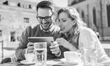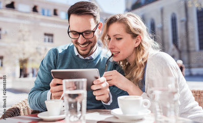 Young couple sitting in the cafe and having fun with tablet. Dating, relationships, love, romance, lifestyle, technology