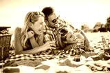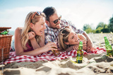 Lucky man with two beautiful girls. Group of friends enjoys picnic on the beach. Lifestyle, vacation, relationships concept