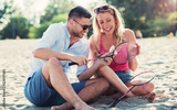 Young couple take a rest after badminton game on the summer beach. Lifestyle, love, dating, vacation concept