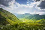 Mountains ranges. Mountain landscape in Svaneti, Georgia. Beautiful view on grassy hills and highlands on summer sunny day with cloudy sky. Scenery mountains nature.