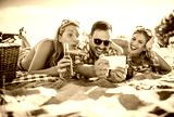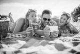 Lucky man with two beautiful girls. Group of friends enjoys picnic on the beach. Lifestyle, vacation, relationships concept