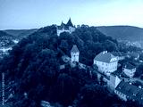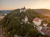 Aerial panorama of medieval Sighisoara in Romania with blue sky, red roofs, bastions, towers and city walls above the Mures river