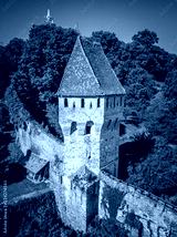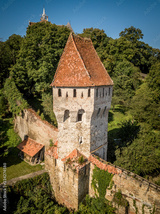 Aerial view of rustic medieval defensive tower with orange, red roof, loopholes on the city walls of Sighisoara with blue sky