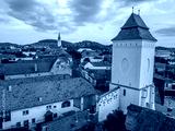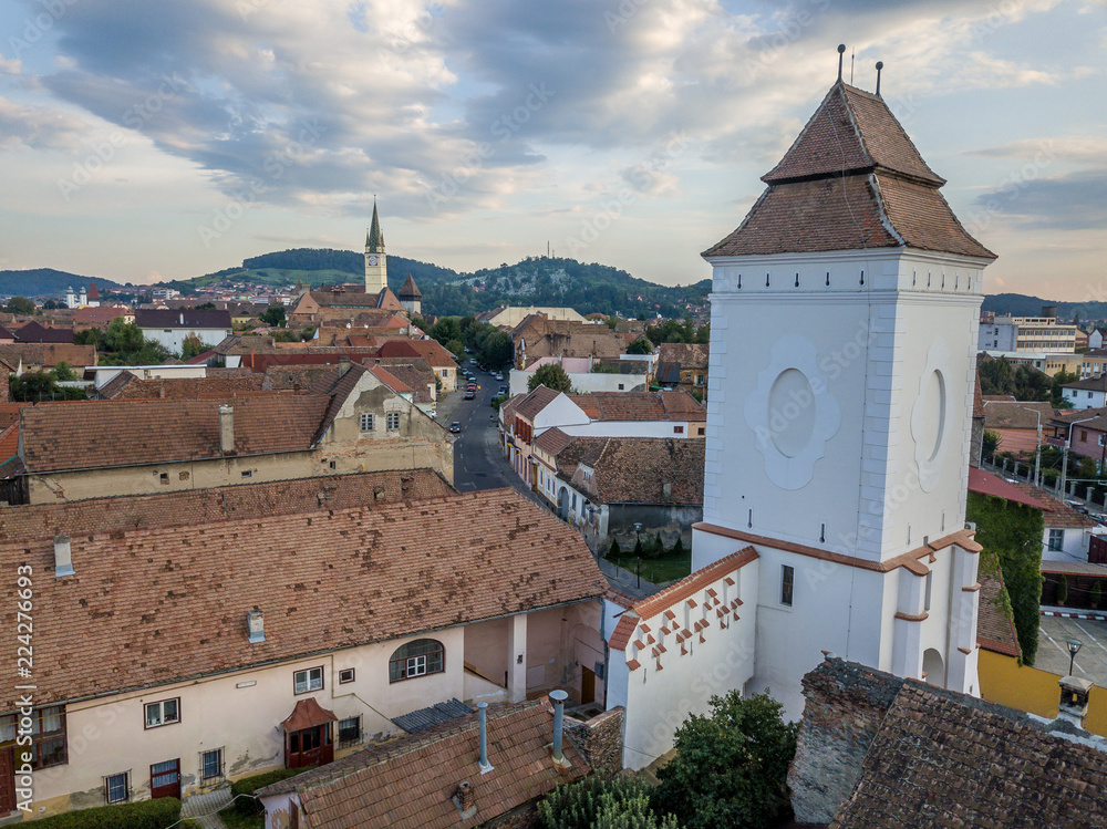 Aerial panorama of medieval Saxon Medias in Transylvania Romania with city walls, church and towers